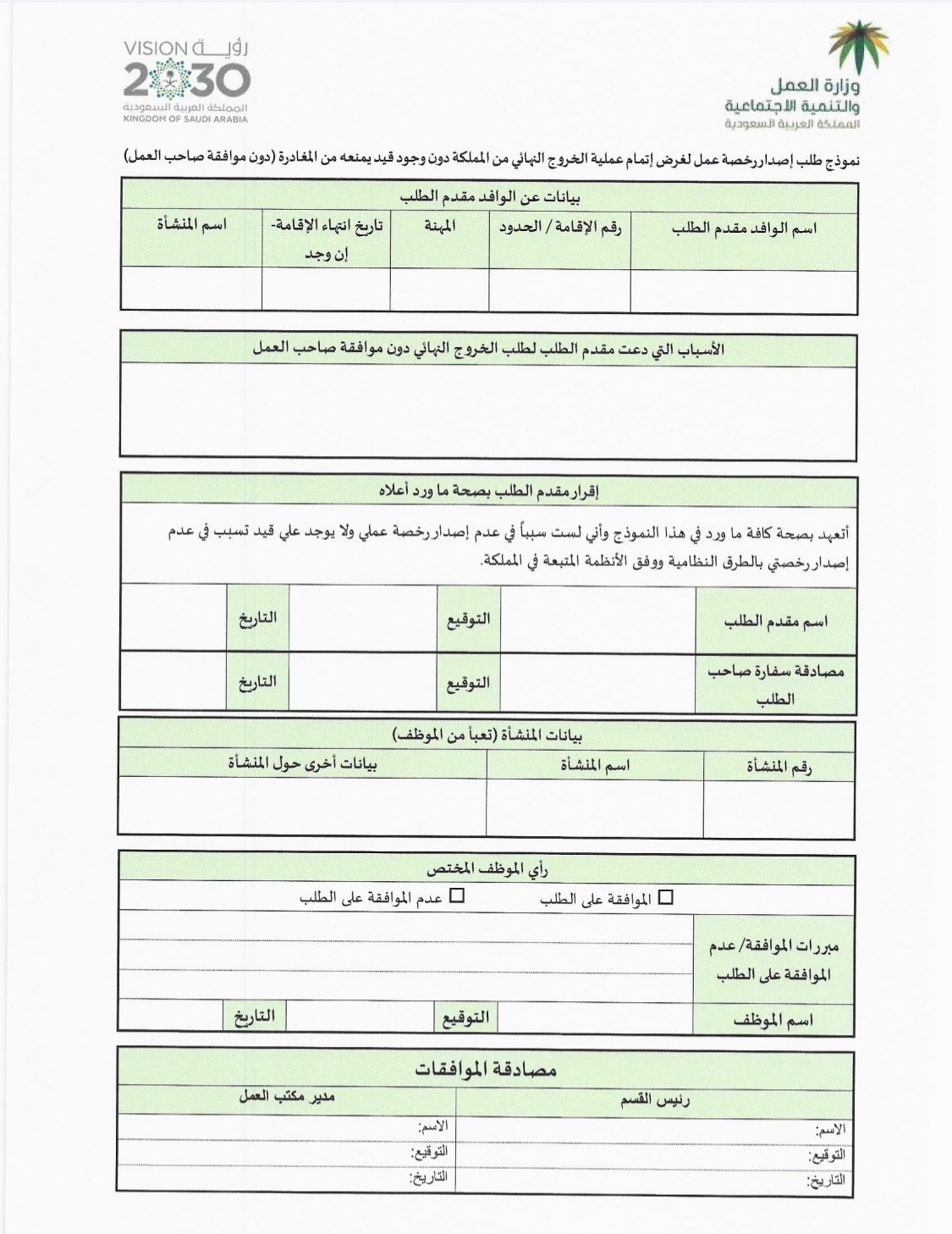 خــالـد قانون On Twitter رخصة إتمام عملية الخروج النهائي للعامل في حال عدم وجود قيد يمنعه من المغادرة نرفق لكم نموذج طلب إصدار رخصة وزارة العمل Https T Co Qjdlqts4t4